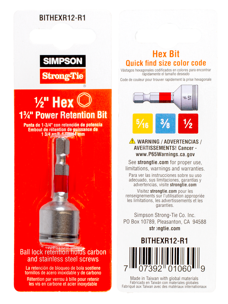 Engineered for reliability and efficiency, the 1/2-inch hex-drive power bit from Simpson Strong-Tie is an essential addition to any toolkit. This versatile bit, with a length of 1-3/4 inches, features a non-magnetized retainer ring that provides a secure grip on the screw head, ensuring a debris-free and reliable drive with every use. Additionally, its color-coded design, marked with a distinctive red band, allows for quick and easy identification of the drive type and size, streamlining the work process. Available in various sizes and types, this power bit is designed to meet diverse fastening needs, making it a valuable resource for both professionals and DIY enthusiasts alike.
