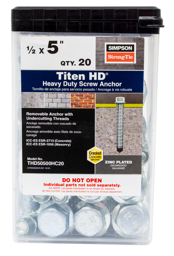 The Titen HD anchor is a high-strength screw anchor for concrete and masonry. It is designed for optimum performance in both cracked and uncracked concrete. The high-strength, easy-to-install Titen HD anchor has been tested and shown to provide outstanding performance in cracked and uncracked concrete under both static and seismic loading conditions. The self-undercutting, non-expansion characteristics of the Titen HD anchor make it ideal for structural applications, even at reduced edge distances and spacings. Recommended for permanent dry, interior non-corrosive environments or temporary outdoor applications.