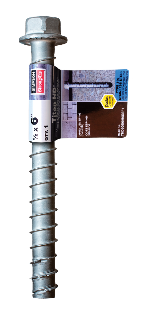 Engineered for exceptional durability and performance, the Titen HD® heavy-duty screw anchor by Simpson Strong-Tie is crafted from Type 316 stainless steel, ensuring superior corrosion resistance even in challenging environments. This anchor is designed to work seamlessly with standard-sized ANSI tolerance drill bits, eliminating the need for specialized tools and facilitating a straightforward installation process. The hex-washer head offers a clean finished look without the requirement of a separate washer, while its innovative carbon-steel thread facilitates efficient cutting through concrete, minimizing expansion damage. Ideal for applications under static or seismic loading conditions, this anchor is an excellent choice for construction professionals seeking a reliable and robust solution for securing base materials.