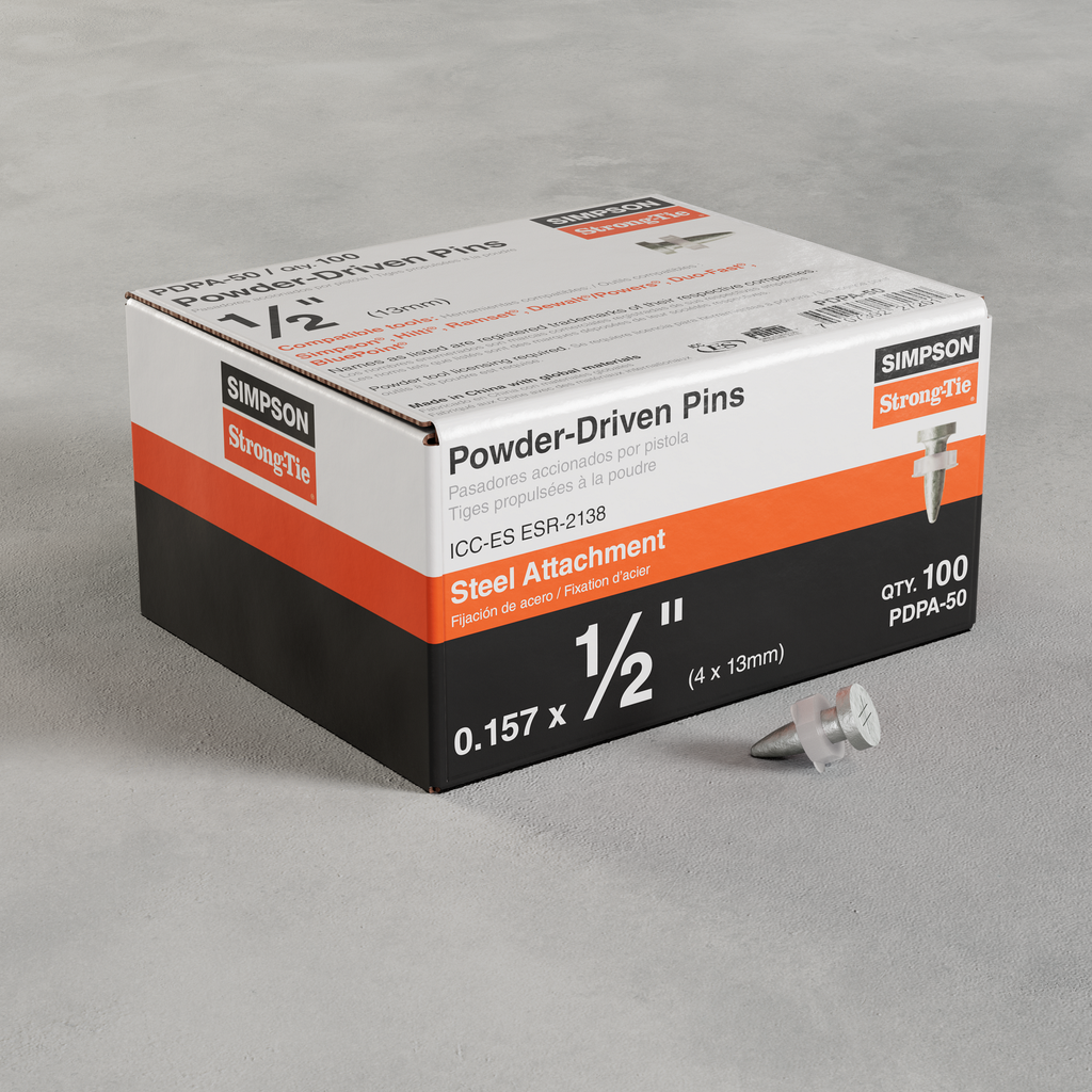 The PDPA is a hardened-steel, powder-actuated fastener designed to fasten building components to concrete, steel and CMU. The PDPA consists of a fastener with a 0.300-in. diameter head and a 0.157-in. diameter shank. The PDPA provides maximum jobsite productivity with fast installation.