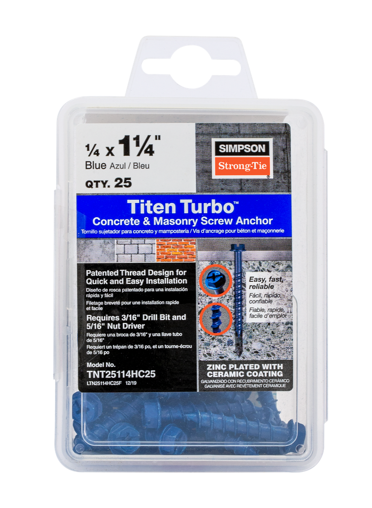 The Titen Turbo™ 1/4 in. x 1-1/4 in. Hex-Head Concrete and Masonry Screw from Simpson Strong-Tie offers a reliable fastening solution specifically designed for concrete applications. This innovative screw features a serrated point that allows for easier installation when fastening wood, making it an efficient choice for both professional contractors and DIY enthusiasts. Its unique Torque Reduction Channel effectively mitigates dust buildup during installation, enhancing thread engagement and reducing the potential for binding in predrilled holes. With its durable zinc plating and baked-on ceramic coating, this product is built to withstand the demands of dry interior environments. Ideal for use with standard drills or impact drivers, this pack of 1440 screws means you’ll have plenty on hand for your projects.