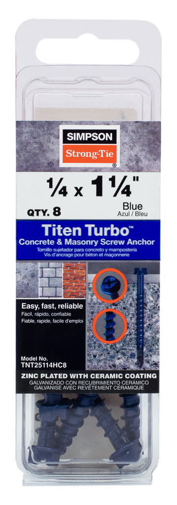 The Simpson Strong-Tie® Titen Turbo™ screw anchor is fast and easy to install, and incredibly reliable in its performance. The secret behind the performance of the Titen Turbo lies in a thread design that lowers driving torque while providing superior holding power. The revolutionary Torque Reduction Channel between the threads gives drilling dust a place to go, thereby significantly reducing torque-related issues like binding, stripping and snapping. This screw anchor delivers consistently trouble-free installation and fastening strength you can depend on.