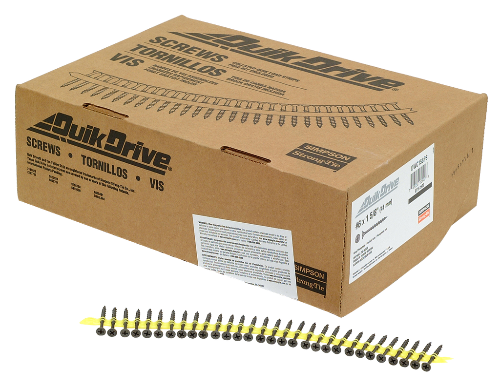 Quik Drive® collated screws combine performance with ease of installation for a variety of residential, commercial and industrial applications. These high-quality fasteners are extensively tested to ensure optimum performance in their target applications. Quik Drive screws are specifically designed for use in Simpson Strong-Tie attachments to ensure problem-free system performance. The patented curved collation strips hold the screws up and away from the work surface, making moving and positioning the tool easier. They are also pointed on the inserted end to simplify loading.