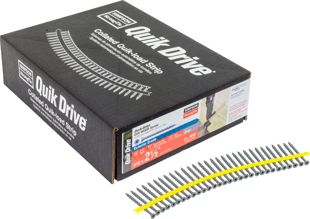 The Deck-Drive DSV Wood screw is a powerful fastening solution for preservative-treated decking applications. With its under-head nibs and fast-start tip, the DSV is ideally suited to be driven and countersunk into today’s wood deck boards. The shank is designed to withstand the swelling and shrinkage that is common with fast-growth lumber. Available in hand-drive and in collated strips for use in the Simpson-Strong-Tie® Quik Drive® auto-feed screw driving system, DSV screws are also offered in a variety of sizes to fasten fascia and trim.