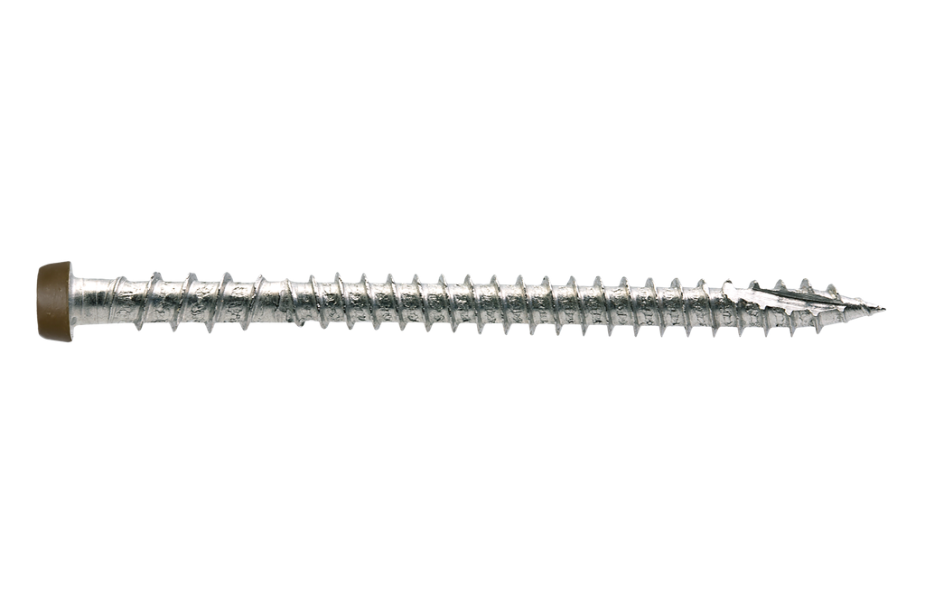 The Type 316 stainless-steel Deck-Drive DCU Composite screw provides severe-level corrosion resistance for all types of composite and PVC decking, and is especially suited for applications in environments with chlorides. The DCU penetrates composite decking with a Type-17 point and is engineered with inverted upper threads that clear excess material to ensure a clean, secure installation. The color-matching painted heads blend with popular manufacturers’ decking for a more concealed, professional finish.