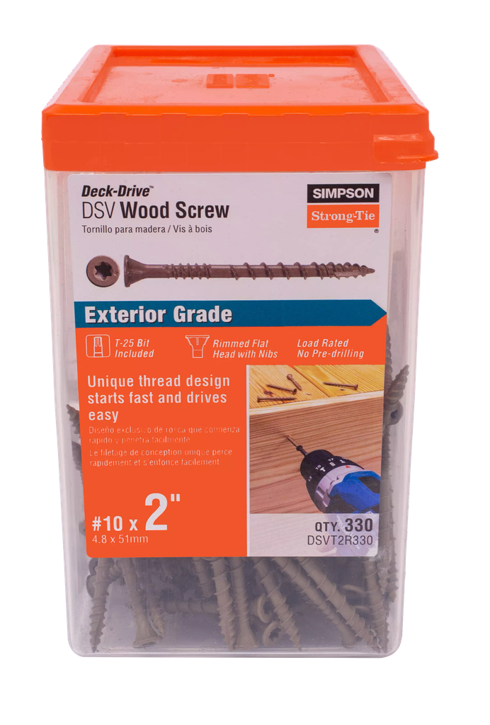Crafted for durability and efficiency, the Simpson Strong-Tie Deck-Drive DSV WOOD Screws are designed specifically for use with pressure-treated lumber and provide a robust solution for your decking needs. With low-torque threads, these screws allow for up to 35% more screws to be driven on a single battery charge, making your installation process quicker and more efficient. Their high-low tip ensures fast starts, while the rimmed flat head with nibs countersinks easily, offering a polished finish that enhances the overall appearance of your project. The Quik Guard coating delivers exceptional corrosion resistance, comparable to hot-dip galvanization, ensuring longevity in various exposure conditions. Each package contains 330 screws, along with a T25 6-lobe driver bit, making this an essential addition to any construction toolkit.