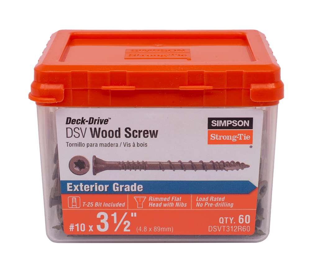 The DSVT312R60 Deck-Drive™ DSV Wood Screw by Simpson Strong-Tie combines advanced engineering with practical performance to enhance your woodworking projects. Featuring low-torque threads, these screws allow for driving up to 35% more on a single battery charge, making them efficient and reliable for various applications. Their optimized threading is designed specifically for dimensional lumber, while the Quik Guard® coating provides superior corrosion resistance, matching the protection of hot-dip galvanization in many environments.