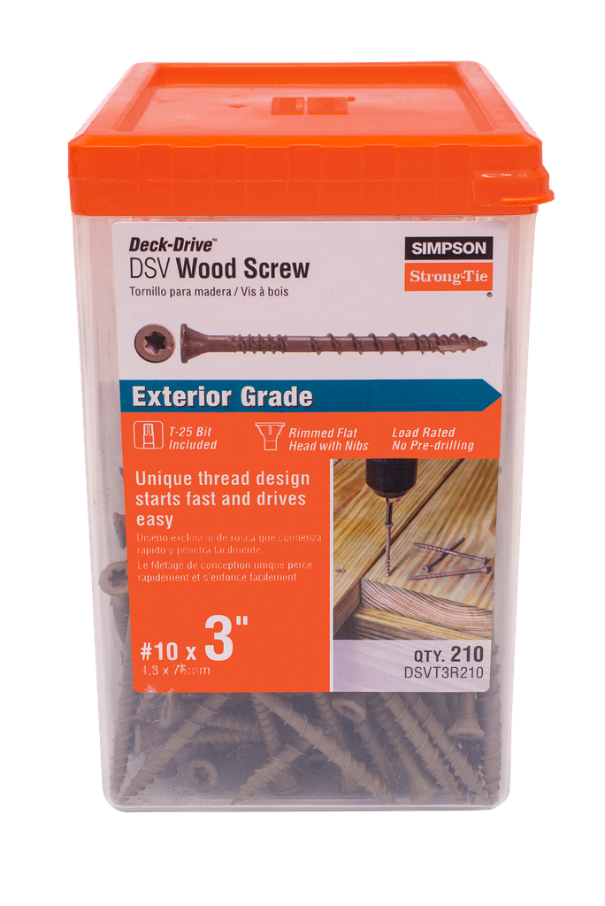 The Simpson Strong-Tie® Deck-Drive DSV Wood screw is a powerful fastening solution for preservative-treated decking applications. With its underhead nibs and fast-start tip, the DSV is ideally suited to be driven and countersunk into today’s wood deck boards. The shank is designed to withstand the swelling and shrinkage that is common with fast-growth lumber. DSV screws are also offered in a variety of sizes to fasten fascia and trim.