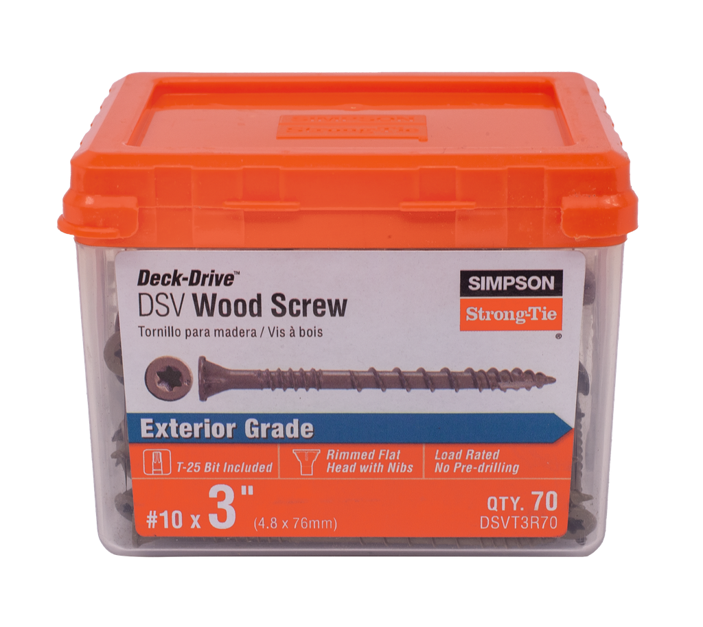 The Simpson Strong-Tie® Deck-Drive DSV Wood screw is a powerful fastening solution for preservative-treated decking applications. With its underhead nibs and fast-start tip, the DSV is ideally suited to be driven and countersunk into today’s wood deck boards. The shank is designed to withstand the swelling and shrinkage that is common with fast-growth lumber. DSV screws are also offered in a variety of sizes to fasten fascia and trim.
