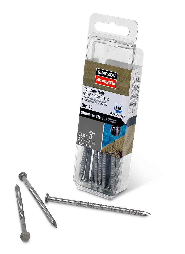Simpson Strong-Tie offers a wide variety of fasteners to meet the requirements for every project type. The preservative-treated wood decking nail is an exterior nail that provides a powerful, corrosion-resistant fastening solution to help make your outside living space as long lasting as the interior of your home. The nail is designed for use in deck and dock projects and features a larger shank diameter allowing for easy installation into both green and seasoned preservative-treated pine. The annular ring shank of this decking nail provides increased withdrawal resistance for a longer life in your decking projects.