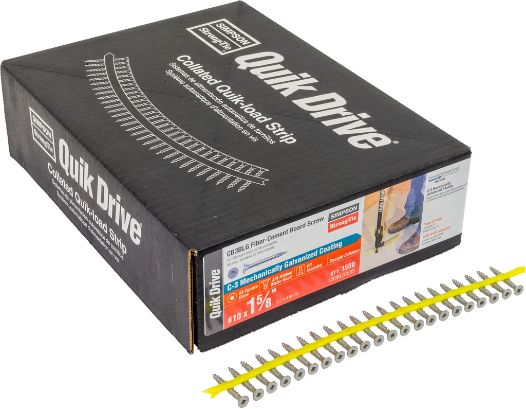 Engineered for reliable performance in fastening fiber-cement boards, these collated screws from Simpson Strong-Tie are designed with precision in mind. Featuring coarse threads and a Type-17 point, installation is made easier, allowing the screws to drive smoothly into a variety of materials. The 0.375-inch ribbed wafer head is equipped with nibs that facilitate easy countersinking, ensuring a flush finish. Each box includes two driver bits for the #3 undersized square drive, which enhances usability and convenience on the job. With a C-3 mechanically galvanized coating, these screws offer exceptional resistance against corrosion, making them a dependable choice for various construction applications while adhering to safety standards about chemical exposure.