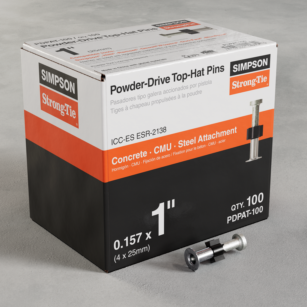 Simpson Strong-Tie offers a full range of gas- and powder-actuated tools and fasteners designed to maximize jobsite productivity and operator comfort in most applications. The PDPAT is a hardened-steel, powder-actuated top-hat pin designed to fasten building components to concrete, steel and CMU. The PDPAT fastener has a 0.300-in. diameter head with a 0.157-in. diameter shank and a steel top-hat assembly for fast loading and centering of the pin in the nosepiece of the tool.
