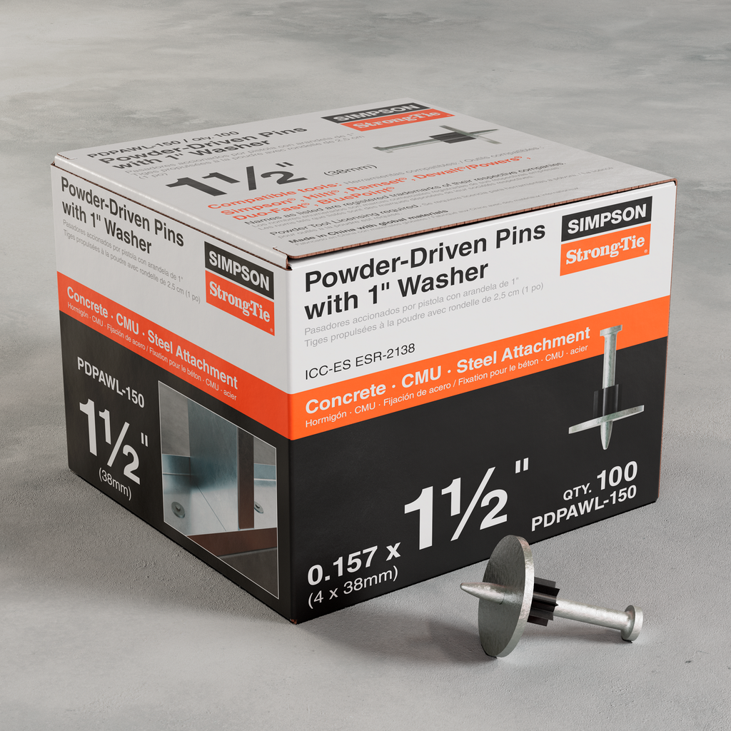 Simpson Strong-Tie offers a full range of gas- and powder-actuated tools and fasteners designed to maximize jobsite productivity and operator comfort. The PDPAWL is a powder-actuated washered pin designed to fasten building components to concrete, steel and CMU. The PDPAWL consists of a hardened-steel PDPA pin preassembled with a 1-in. washer that provides additional bearing surface for enhanced upload resistance. The PDPAWL is designed for use with Simpson Strong-Tie® powder-actuated tool systems as well as other common tools.