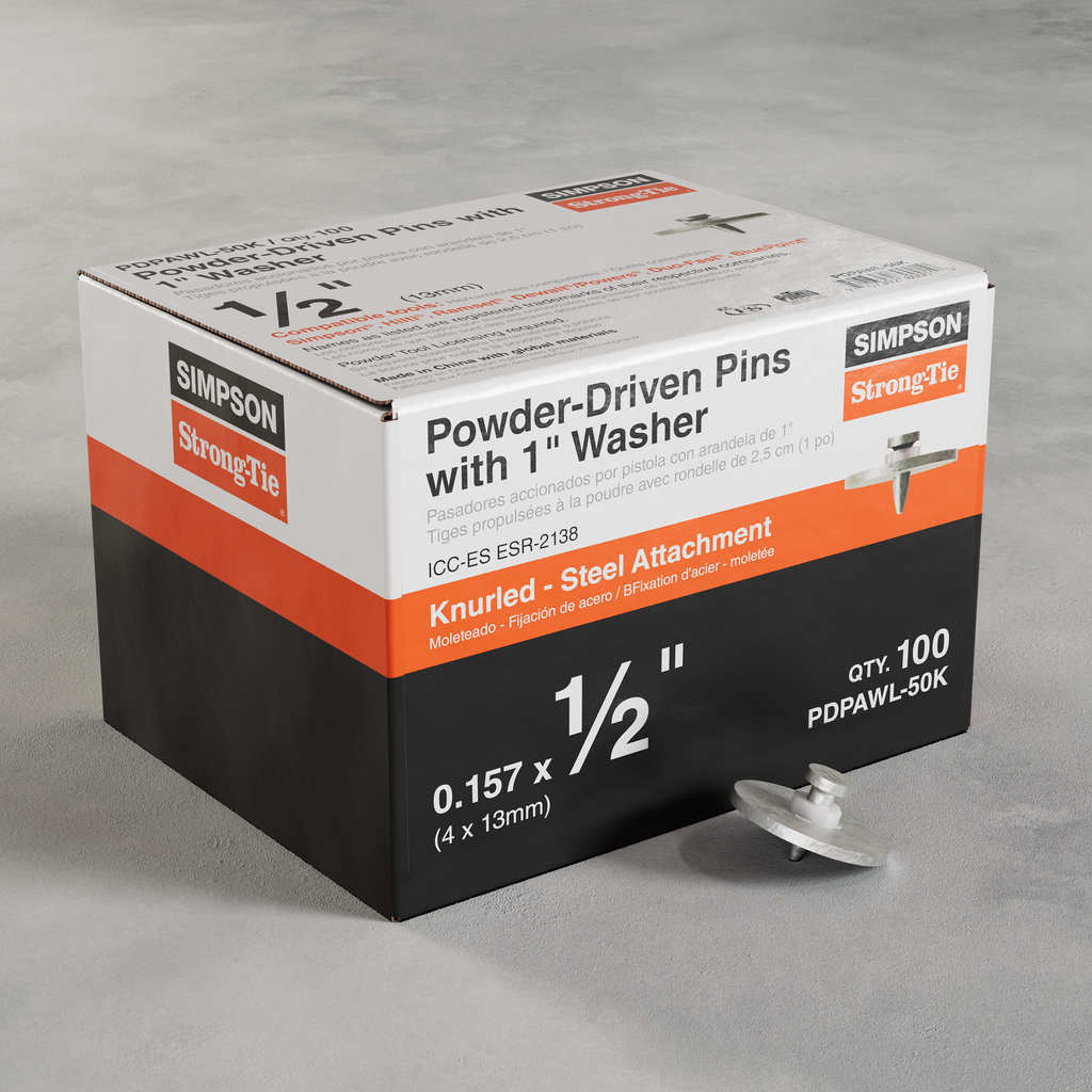 Simpson Strong-Tie offers a full range of gas- and powder-actuated tools and fasteners designed to maximize jobsite productivity and operator comfort. The PDPAWL is a powder-actuated washered pin designed to fasten building components to concrete, steel and CMU. The PDPAWL consists of a hardened-steel PDPA pin preassembled with a 1-in. washer that provides additional bearing surface for enhanced upload resistance. The PDPAWL is designed for use with Simpson Strong-Tie® powder-actuated tool systems as well as other common tools.
