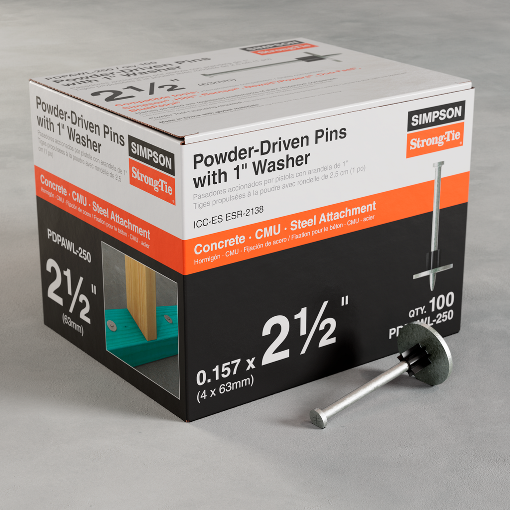 Simpson Strong-Tie offers a full range of gas- and powder-actuated tools and fasteners designed to maximize jobsite productivity and operator comfort. The PDPAWL is a powder-actuated washered pin designed to fasten building components to concrete, steel and CMU. The PDPAWL consists of a hardened-steel PDPA pin preassembled with a 1-in. washer that provides additional bearing surface for enhanced upload resistance. The PDPAWL is designed for use with Simpson Strong-Tie® powder-actuated tool systems as well as other common tools.