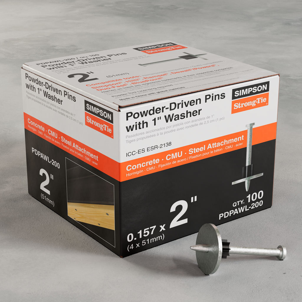 Simpson Strong-Tie offers a full range of gas- and powder-actuated tools and fasteners designed to maximize jobsite productivity and operator comfort. The PDPAWL is a powder-actuated washered pin designed to fasten building components to concrete, steel and CMU. The PDPAWL consists of a hardened-steel PDPA pin preassembled with a 1-in. washer that provides additional bearing surface for enhanced upload resistance. The PDPAWL is designed for use with Simpson Strong-Tie® powder-actuated tool systems as well as other common tools.
