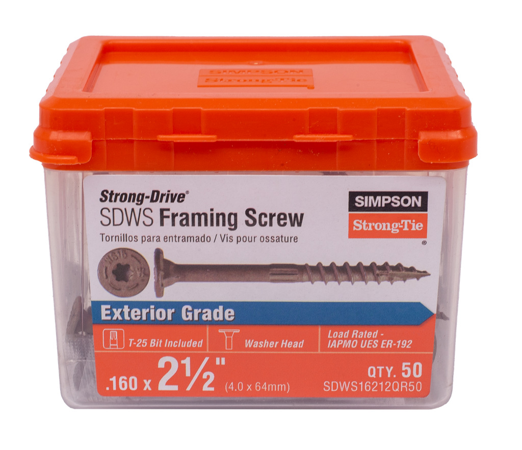 The SDWS Framing screw is designed and load-rated for replacing 16d, 10d and 8d nails in framing applications. The SDWS Framing screw is 0.160 in. in diameter and superior to nails in holding power and pull-out resistance. It is code listed under IAPMO UES ER-192 and meets 2018 and 2021 IRC® and IBC® code requirements for several common wood framing applications.