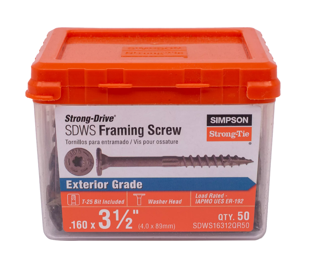 The Simpson Strong-Drive® SDWS™ FRAMING Screw is engineered for robust structural applications, offering exceptional versatility in both indoor and outdoor environments. With a 0.160-inch diameter and a length of 3-1/2 inches, these screws come equipped with a Quik Guard® coating that enhances corrosion resistance, ensuring durability in various conditions. Featuring a unique SawTooth® Type-17 tip, they facilitate quick installation without the need for predrilling, while the large head with underhead box-nibs ensures clean countersinking and increased bearing capacity. The innovative 6-lobe drive design minimizes cam-outs, resulting in a smoother driving experience, complemented by serrated threads that reduce installation torque for easier handling. Each pack contains 50 screws, making this product an excellent choice for both professionals and DIY enthusiasts looking for reliability and strength in their projects.