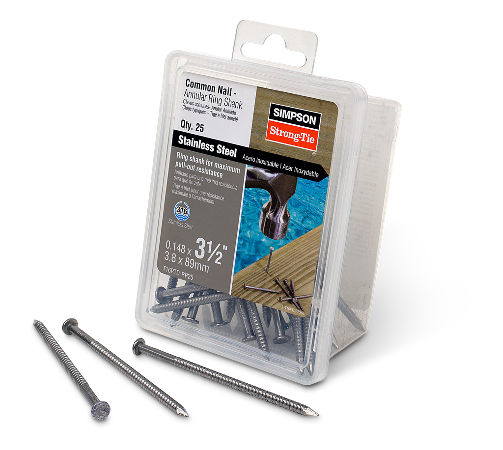 Simpson Strong-Tie offers a wide variety of fasteners to meet the requirements for every project type. The preservative-treated wood decking nail is an exterior nail that provides a powerful, corrosion-resistant fastening solution to help make your outside living space as long lasting as the interior of your home. The nail is designed for use in deck and dock projects and features a larger shank diameter allowing for easy installation into both green and seasoned preservative-treated pine. The annular ring shank of this decking nail provides increased withdrawal resistance for a longer life in your decking projects.