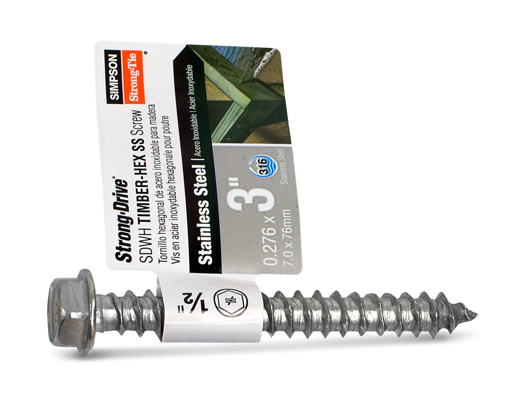 The Strong-Drive® SDWH™ TIMBER-HEX screw by Simpson Strong-Tie is crafted from Type 316 stainless steel, providing exceptional corrosion resistance for a variety of applications. Designed with a unique “box” thread and raised-ridge technology, this screw significantly reduces driving torque and installation time, making it an efficient choice for both professionals and DIY projects. Its hex-washer head offers a large bearing area, ensuring stability and secure fastening, while the capability for use in ledger applications adds to its versatility. With no predrilling required in most instances, this screw simplifies the installation process, enhancing productivity on the job.