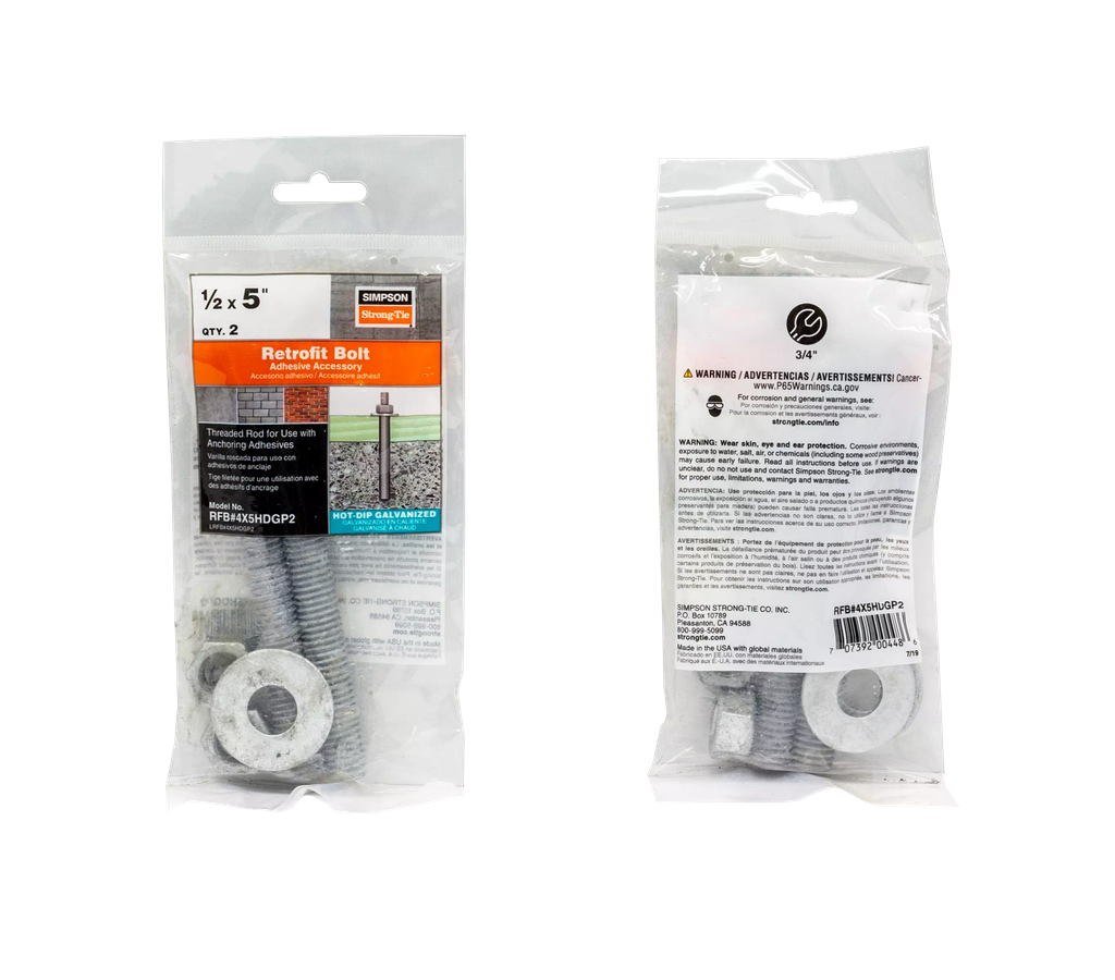 The Simpson Strong-Tie® RFB retrofit bolt is a precut threaded rod, supplied with nut and washer, to use with anchoring adhesives to anchor into existing concrete and masonry. Each end of the threaded rod is stamped with rod length in inches and color-coded indicating the grade or type of steel for quick and easy identification post-installation. For 1/2 in. diameters and larger, the distinctive No-Equal® symbol is also stamped. When used with a Simpson Strong-Tie adhesive, the RFB offers a complete engineered anchoring system.