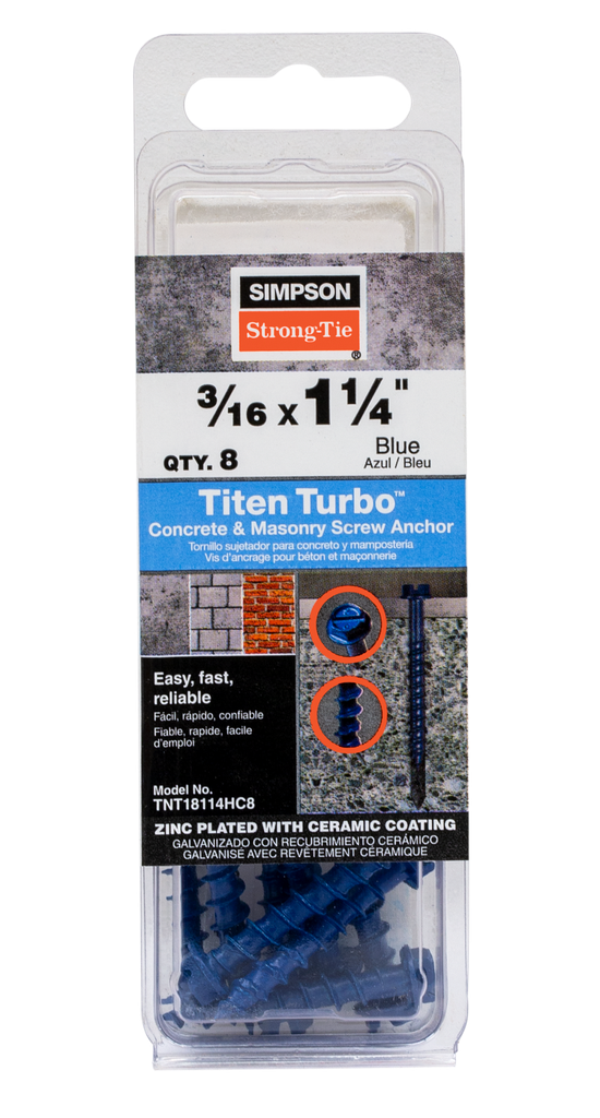 The Simpson Strong-Tie® Titen Turbo™ screw anchor is fast and easy to install, and incredibly reliable in its performance. The secret behind the performance of the Titen Turbo lies in a thread design that lowers driving torque while providing superior holding power. The revolutionary Torque Reduction Channel between the threads gives drilling dust a place to go, thereby significantly reducing torque-related issues like binding, stripping and snapping. This screw anchor delivers consistently trouble-free installation and fastening strength you can depend on.