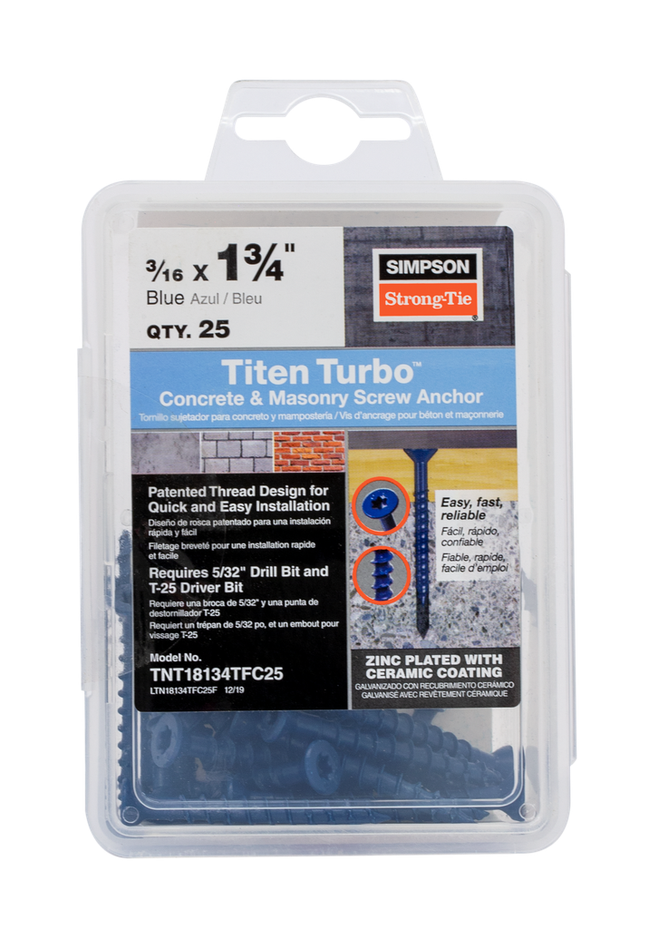 The Simpson Strong-Tie® Titen Turbo™ screw anchor is fast and easy to install, and incredibly reliable in its performance. The secret behind the performance of the Titen Turbo lies in a thread design that lowers driving torque while providing superior holding power. The revolutionary Torque Reduction Channel between the threads gives drilling dust a place to go, thereby significantly reducing torque-related issues like binding, stripping and snapping. This screw anchor delivers consistently trouble-free installation and fastening strength you can depend on.