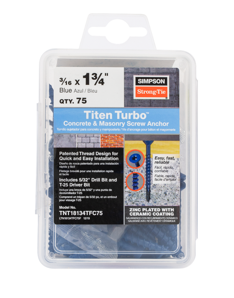 The Simpson Strong-Tie® Titen Turbo™ screw anchor is fast and easy to install, and incredibly reliable in its performance. The secret behind the performance of the Titen Turbo lies in a thread design that lowers driving torque while providing superior holding power. The revolutionary Torque Reduction Channel between the threads gives drilling dust a place to go, thereby significantly reducing torque-related issues like binding, stripping and snapping. This screw anchor delivers consistently trouble-free installation and fastening strength you can depend on.
