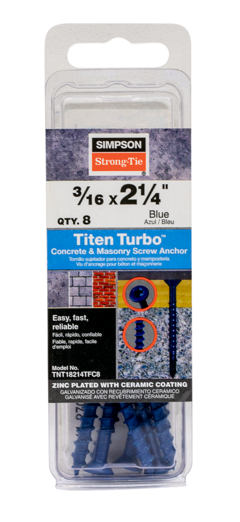 The Simpson Strong-Tie® Titen Turbo™ screw anchor is fast and easy to install, and incredibly reliable in its performance. The secret behind the performance of the Titen Turbo lies in a thread design that lowers driving torque while providing superior holding power. The revolutionary Torque Reduction Channel between the threads gives drilling dust a place to go, thereby significantly reducing torque-related issues like binding, stripping and snapping. This screw anchor delivers consistently trouble-free installation and fastening strength you can depend on.