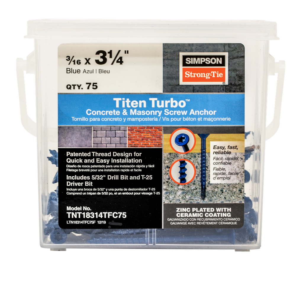 The Simpson Strong-Tie® Titen Turbo™ screw anchor is fast and easy to install, and incredibly reliable in its performance. The secret behind the performance of the Titen Turbo lies in a thread design that lowers driving torque while providing superior holding power. The revolutionary Torque Reduction Channel between the threads gives drilling dust a place to go, thereby significantly reducing torque-related issues like binding, stripping and snapping. This screw anchor delivers consistently trouble-free installation and fastening strength you can depend on.