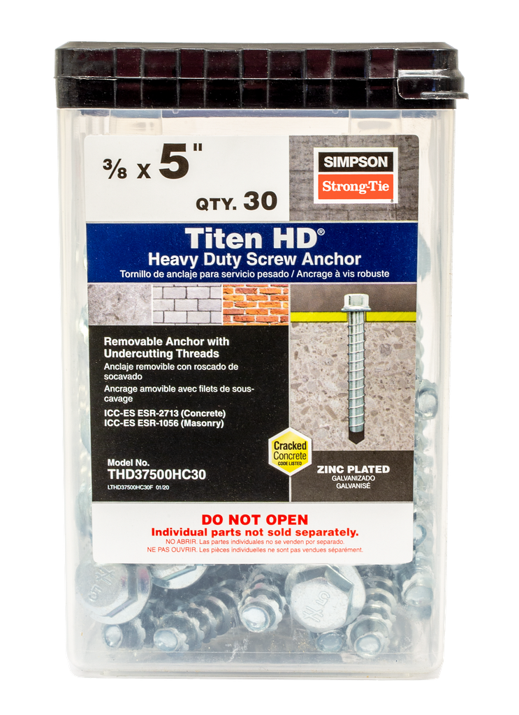 The Titen HD anchor is a high-strength screw anchor for concrete and masonry. It is designed for optimum performance in both cracked and uncracked concrete. The high-strength, easy-to-install Titen HD anchor has been tested and shown to provide outstanding performance in cracked and uncracked concrete under both static and seismic loading conditions. The self-undercutting, non-expansion characteristics of the Titen HD anchor make it ideal for structural applications, even at reduced edge distances and spacings. Recommended for permanent dry, interior non-corrosive environments or temporary outdoor applications.