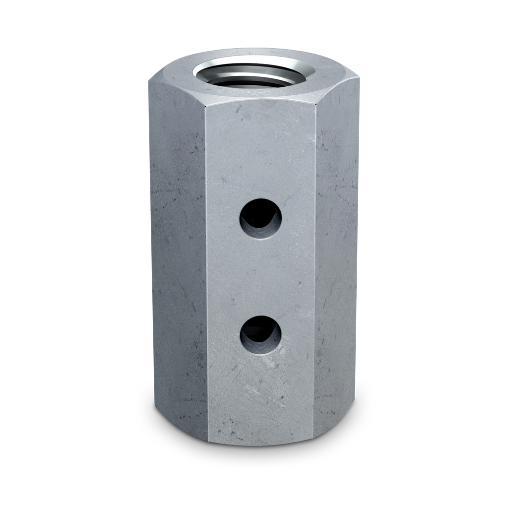 The Simpson Strong-Tie® CNW coupler nut is designed to connect threaded rods to one another and to anchor bolts. These nuts are designed to exceed the specified minimum tensile capacity of the corresponding bolts and threaded rod. All CNW coupler nuts feature a positive stop to help ensure even threading into each end of the nut and a Witness® hole as a means to verify when rods are properly installed.