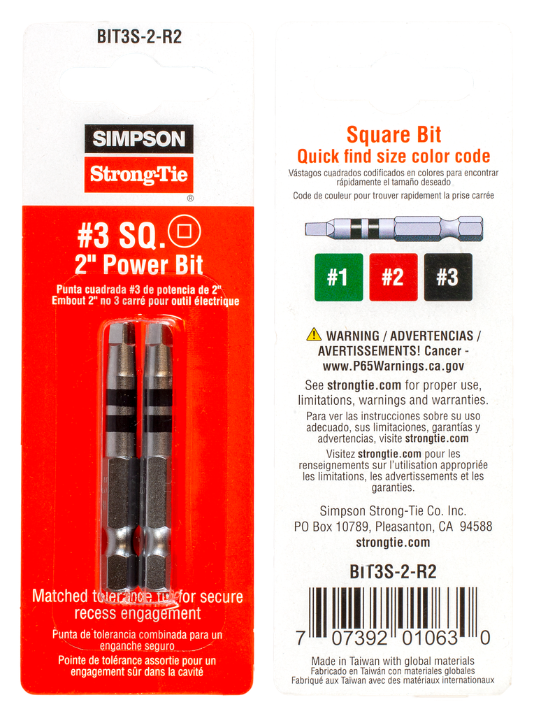 Simpson Strong-Tie® driver bits are now color-coded to make size and type selection easier. Available in 6-lobe, square and hex drive, these driver bits have color bands that make choosing the correct size for your fasteners a breeze. Our industrial-grade driver bits are specially designed for a secure fit with Simpson Strong-Tie fasteners and will outperform sub-standard bits commonly prone to cam-out and stripping.