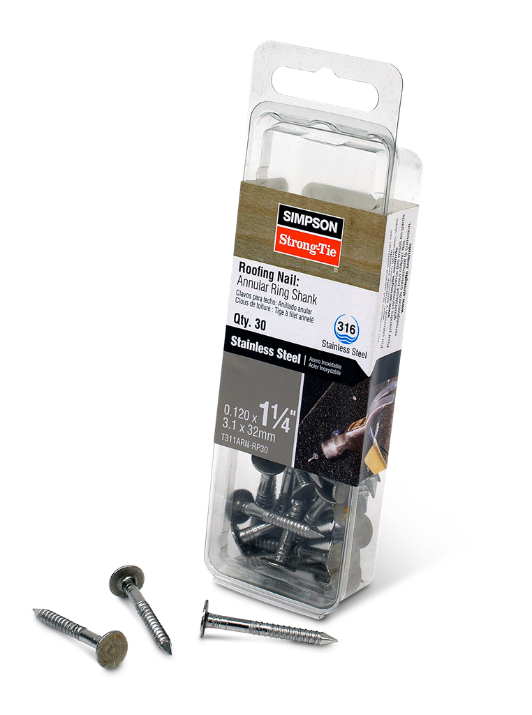 The Simpson Strong-Tie® Roofing Nail – Annular Ring Shank was designed to optimize holding power, while incorporating higher levels of corrosion resistance. Its large flat head provides extra bearing surface to firmly secure roofing material and its annular ring shank increases withdrawal resistance. A variety of sizes are available in Type 316 and Type 304 stainless steel.