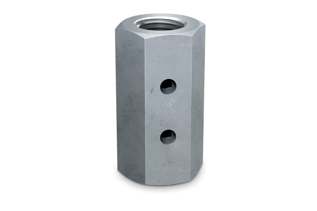 The Simpson Strong-Tie® CNW coupler nut is designed to connect threaded rods to one another and to anchor bolts. These nuts are designed to exceed the specified minimum tensile capacity of the corresponding bolts and threaded rod. All CNW coupler nuts feature a positive stop to help ensure even threading into each end of the nut and a Witness® hole as a means to verify when rods are properly installed.