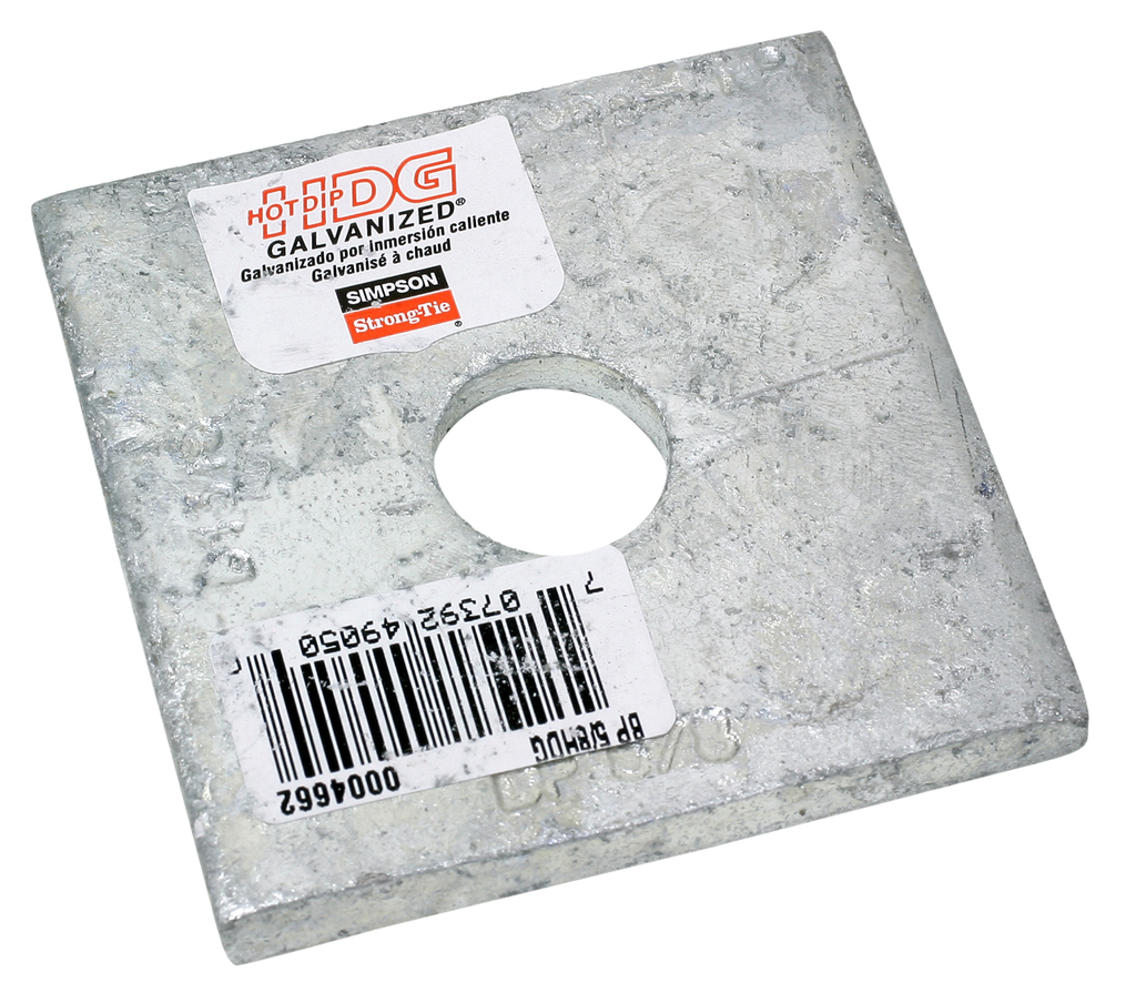 The BP 2-1/2 in. x 2-1/2 in. hot-dip galvanized bearing plate by Simpson Strong-Tie is engineered for superior performance in exterior and treated-wood applications. Featuring a robust 1/4 in. steel construction, this plate is designed to withstand various environmental conditions, while the hot-dip galvanization process provides an additional layer of corrosion resistance, ensuring long-lasting durability. The 5/8 in. bolt diameter allows for secure fastening, making it a reliable choice for structural support and stability in your projects.