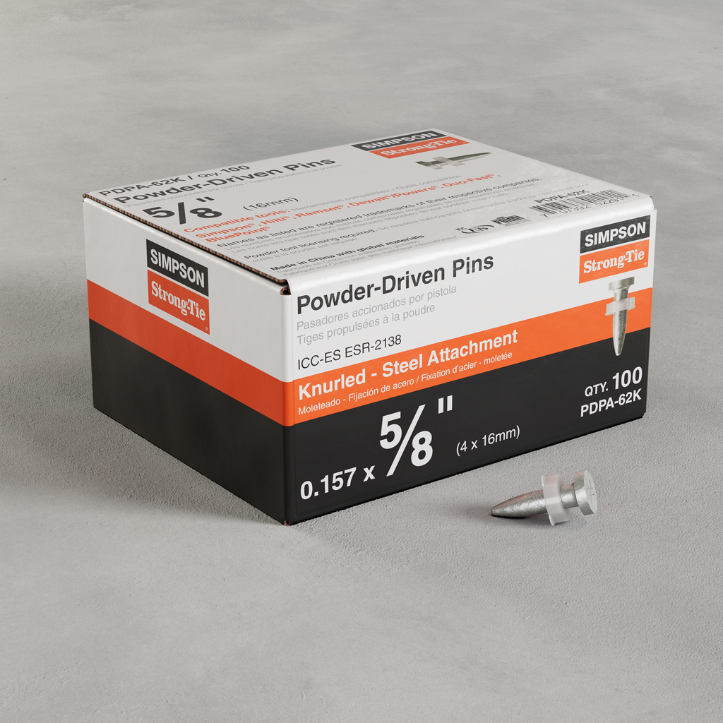 The PDPA-62K powder-actuated knurled drive pin from Simpson Strong-Tie is engineered for high-strength applications, specifically designed to work with Simpson Strong-Tie’s powder-actuated tool systems and other commonly used tools. Featuring a knurled shank for enhanced grip and a head diameter of 0.300 inches, this pin is ideal for securing materials to A36 and A572 Grade 50 structural steel, ensuring a reliable hold in demanding environments. It is code listed per ICC-ES ESR-2138, demonstrating compliance with stringent building standards and regulations. With 100 pins included, this product is a vital component for professionals seeking efficiency and precision in their fastening tasks.