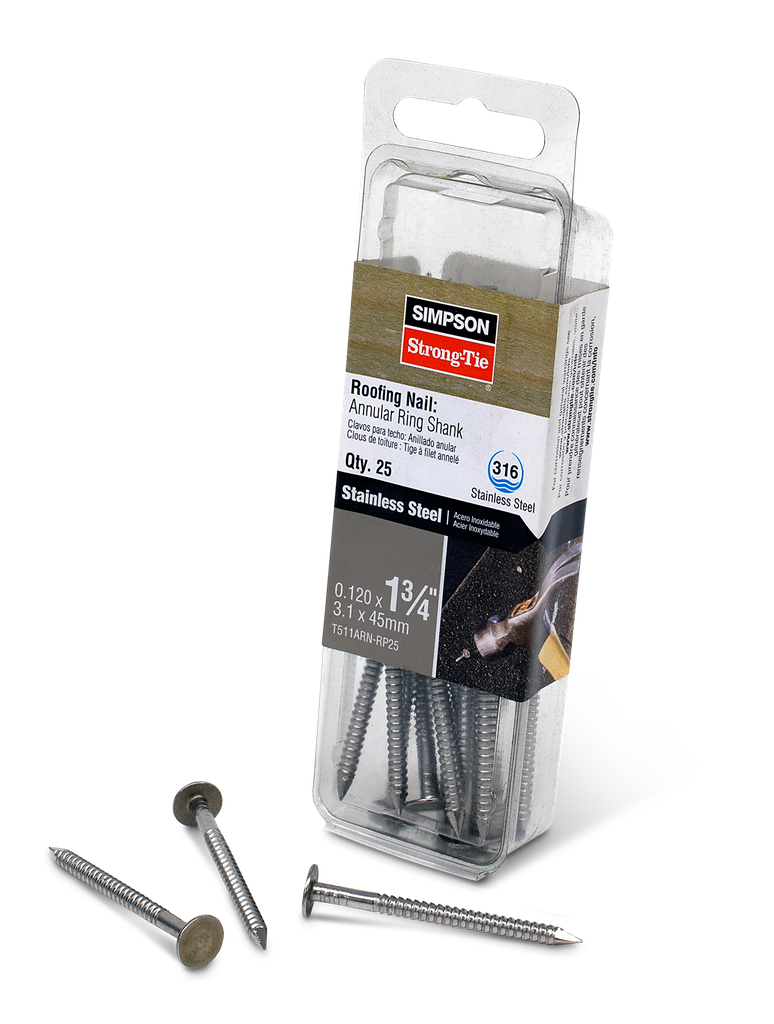 Engineered for superior holding power, these roofing nails feature an annular ring shank that enhances withdrawal resistance, ensuring a secure attachment to wood members and plywood roof decks. Each nail measures 1-3/4 inches in length and is crafted from Type 316 stainless steel, providing exceptional corrosion resistance that withstands severe weather conditions, making them ideal for use on slate roofs. The large, flat head design offers an extra bearing surface, effectively securing your roofing materials in place. Please be advised that use of this product may expose you to chemicals, including wood dust, which is known to cause cancer in the state of California; further information can be found at www.P65Warnings.ca.gov.