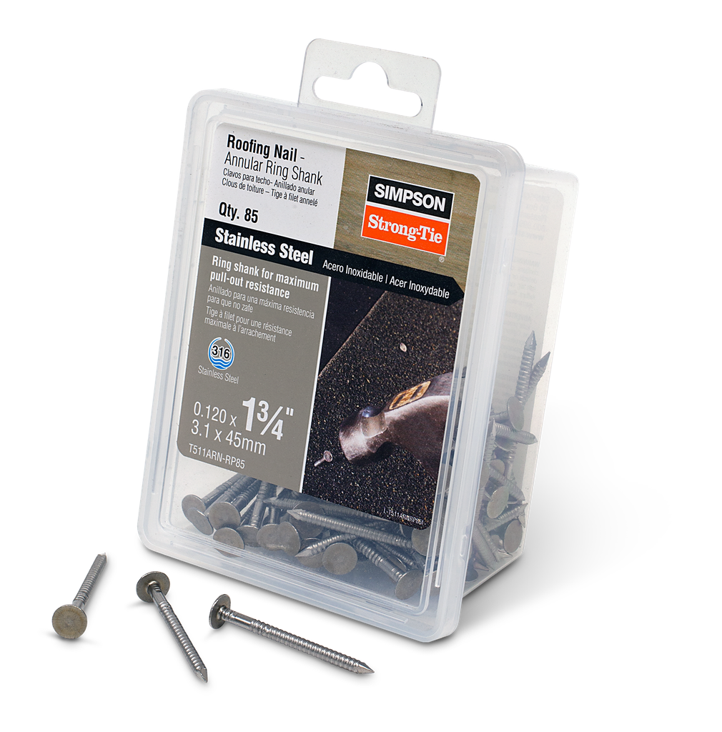 Engineered for exceptional durability and reliability, the annular ring shank roofing nail by Simpson Strong-Tie is designed to meet the demands of various roofing applications. With a length of 1-3/4 inches and a .120-inch diameter, these nails feature a large, flat head that provides a robust bearing surface, ensuring effective grip and secure fastening of roofing materials. The innovative annular ring shank not only enhances withdrawal resistance but also guarantees a strong attachment to wood substrates and plywood roof decks, making it an ideal choice for both slate and traditional roofing options. Crafted from Type 316 stainless steel, these nails excel in severe environments, offering superior corrosion resistance to withstand challenging weather conditions.