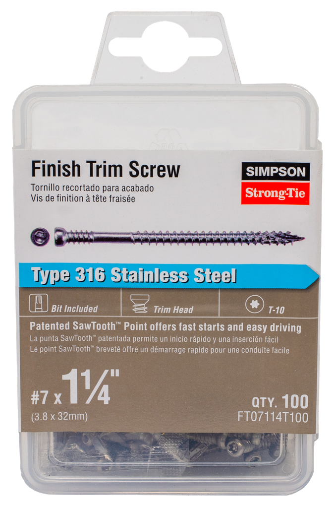 Engineered for superior performance in demanding environments, these finish trim screws from Simpson Strong-Tie offer a reliable solution for various application needs. Crafted from Type 316 stainless steel, they are specifically designed to withstand wet, salty, or other highly corrosive conditions, making them ideal for both indoor and outdoor projects. The small, easily concealed head facilitates a clean finish, while patented SawTooth point technology ensures effortless starts and driving. With underhead threads that enhance countersinking and pull-through resistance, these screws help deliver a strong, precise installation every time. Additionally, they come with a T10 6-lobe driver bit for added convenience, ensuring effective use right out of the package.