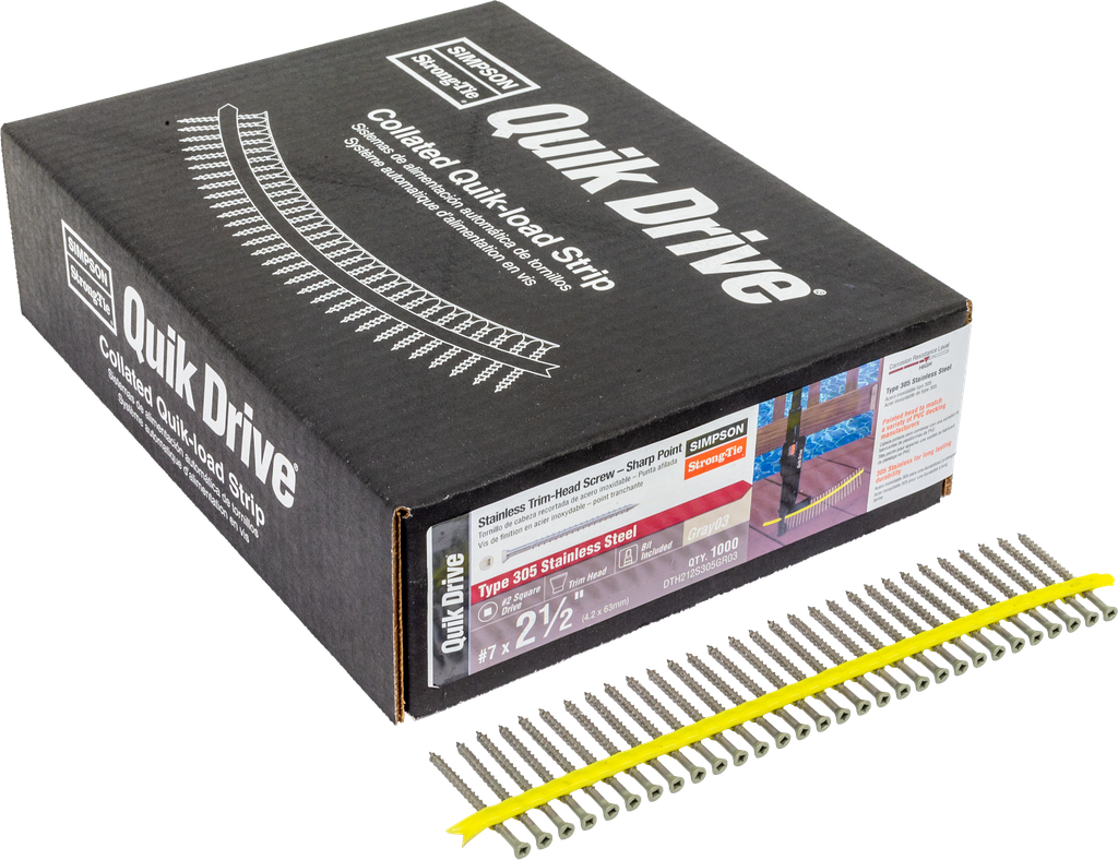 Quik Drive® collated screws combine performance with ease of installation for a variety of residential, commercial and industrial applications. These high-quality fasteners are extensively tested to ensure optimum performance in their target applications. Quik Drive screws are specifically designed for use in our attachments to ensure problem-free system performance. The patented curved collation strips hold the screws up and away from the work surface, making moving and positioning the tool easier. They are also pointed on the inserted end to simplify loading. Available in 13 colors matched to blend with most major PVC and composite decking manufacturers.