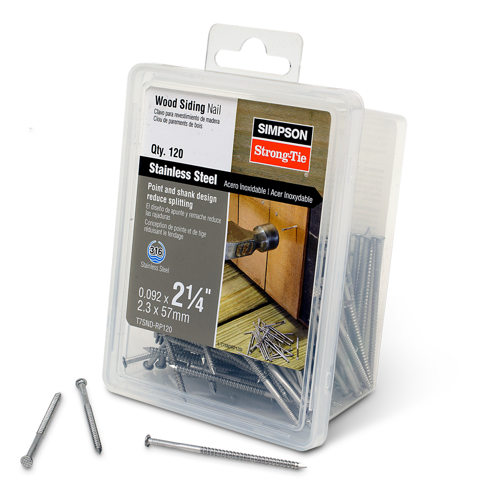 Simpson Strong-Tie offers a wide variety of fasteners to meet the requirements for every project type. Our exterior nails provide powerful, corrosion-resistant fastening solutions to help make your outside living space as long lasting as the interior of your home. The wood siding nail features an annular ring shank for increased withdrawal resistance and a checker-patterned head that blends with wood grain. These nails are ideal for securing wood siding panels with excellent holding power and pull-through resistance.