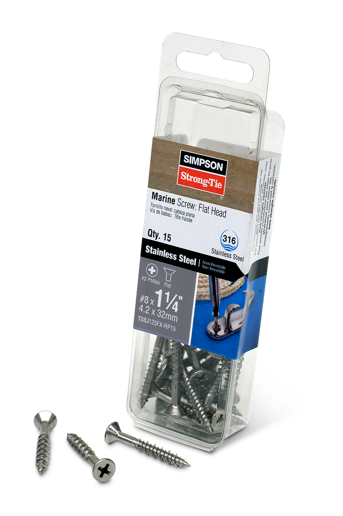 Simpson Strong-Tie provides a broad range of fasteners for boat building and marine trade applications. The Marine screw is designed to fasten securely in fiberglass, plywood and wood-substitute materials for applications that require the ultimate in corrosion protection. This fastener is ideal for applying trim, rub rail and molding to fiberglass boat hulls. These stainless-steel marine screws also come in a pan head.