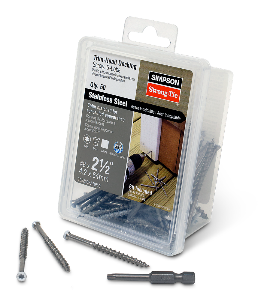 Engineered for durability and precision, these trim-head screws from Simpson Strong-Tie offer exceptional performance for fastening wood decking and select composite decking materials. The Type-17 point design allows for quick and easy starts, while the coarse threads help draw the material tightly against the framing, ensuring a secure connection. With a trim-style head, these screws reduce visibility on the decking surface, maintaining a clean aesthetic. Crafted from Type 316 stainless steel, they provide maximum corrosion resistance, making them ideal for outdoor applications. The 6-lobe drive minimizes driver-bit cam-out, enhancing ease of use and extending the life of your driving tools. For the best results, predilling near board ends is recommended to prevent splitting. Please note that this product may expose you to chemicals known to the State of California to cause cancer; further information can be found at www.P65Warnings.ca.gov.