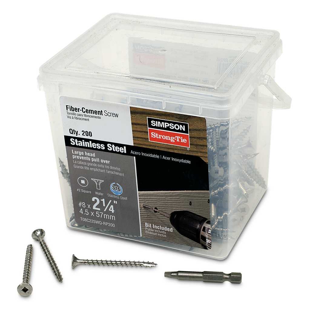 Simpson Strong-Tie offers a variety of fastener styles designed specifically for every project type to help you design and build safer, stronger structures. The fiber-cement screw is ideal for binding fiber-cement siding to stressed-skin panels or lap siding to wood. It features a wafer head with self-countersinking nibs, a type-17 point for fast starts and full-length coarse threading.