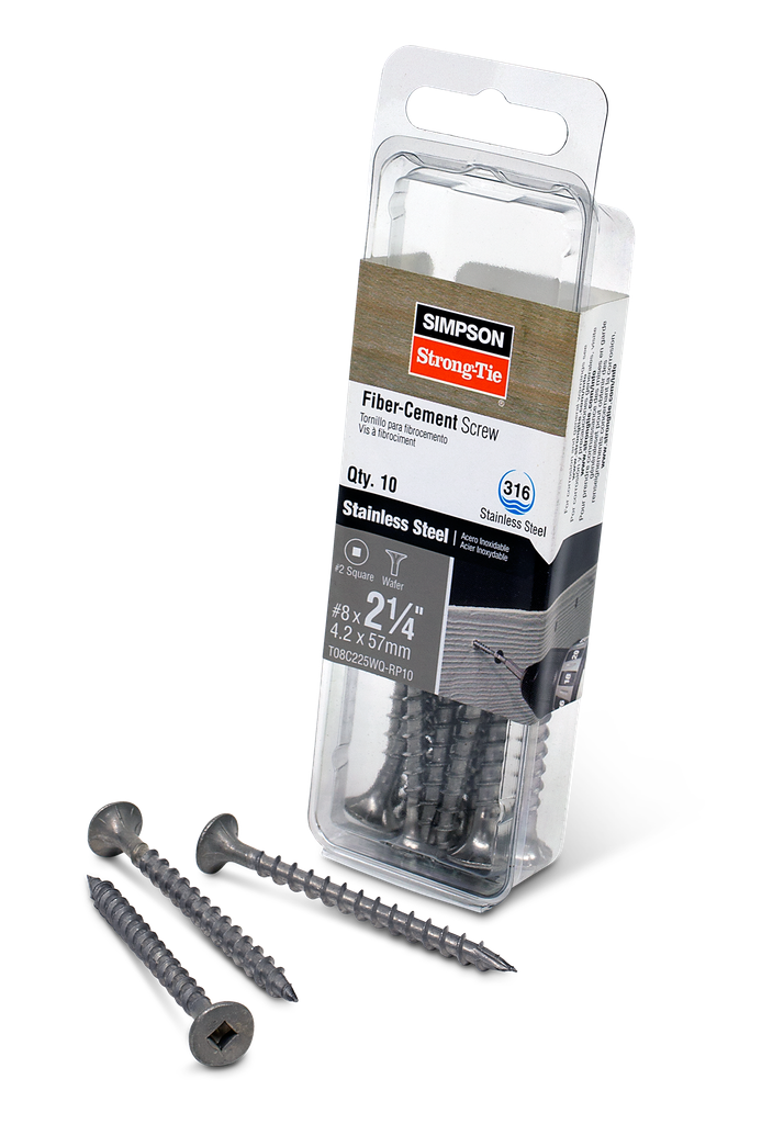 Simpson Strong-Tie offers a variety of fastener styles designed specifically for every project type to help you design and build safer, stronger structures. The fiber-cement screw is ideal for binding fiber-cement siding to stressed-skin panels or lap siding to wood. It features a wafer head with self-countersinking nibs, a type-17 point for fast starts and full-length coarse threading.