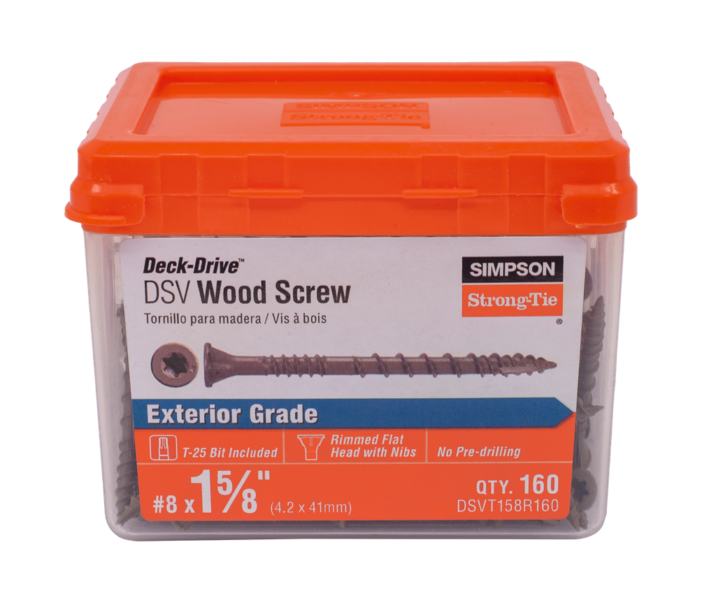 The Simpson Strong-Tie® Deck-Drive DSV Wood screw is a powerful fastening solution for preservative-treated decking applications. With its underhead nibs and fast-start tip, the DSV is ideally suited to be driven and countersunk into today’s wood deck boards. The shank is designed to withstand the swelling and shrinkage that is common with fast-growth lumber. DSV screws are also offered in a variety of sizes to fasten fascia and trim.