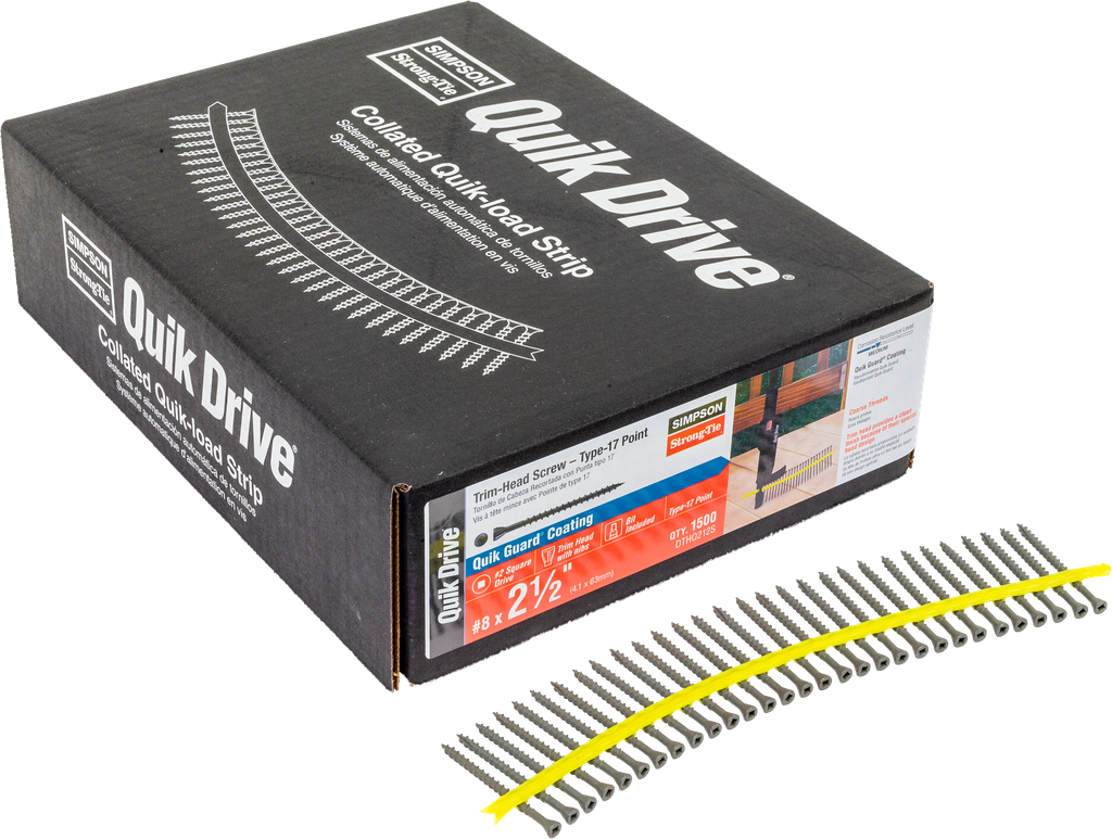Engineered for optimal performance in various woodworking applications, the trim-head screw by Simpson Strong-Tie is designed with a Type-17 point, which allows for effortless penetration into materials, minimizing the chance of splitting. Its coarse threads ensure a firm grip, while the trim head features nibs that simplify countersinking, providing a clean finish to your projects. Each box includes a #2 undersized square drive driver bit for added convenience, and the curved collation ensures that these screws feed smoothly for quick installation. With the added benefit of Quik Guard® coating, these screws offer exceptional corrosion resistance, making them suitable for exterior use and preservative-treated wood applications.