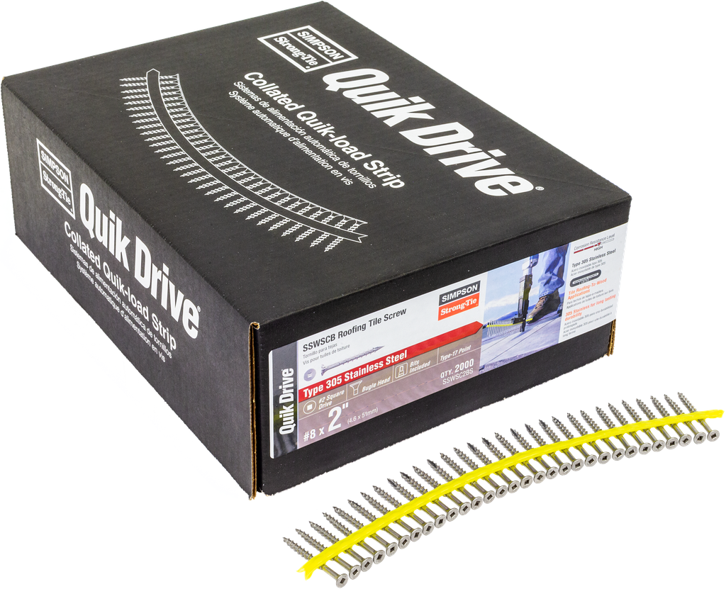 Engineered for superior performance and longevity, the roofing tile screws from Simpson Strong-Tie are made from Type 305 stainless steel, ensuring resistance to corrosion and deterioration over time. These #8 by 2-inch screws feature coarse threads and a #2 square drive for enhanced grip and ease of installation, while the included driver bit (replacement model BIT2S) simplifies the process further. Their bugle head design allows for flush finishes, and the Type-17 point minimizes splitting and enhances driving ease. With a curved collation for improved feeding, these screws are a practical choice for robust roofing applications, delivering both reliability and efficiency on the job site.