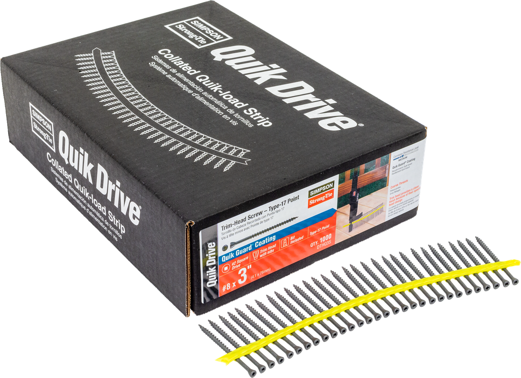 Trim-Head decking screws are available in stainless steel for superior corrosion resistance in marine or high-exposure environments where PVC or composite decks are installed. Trim-Head screws provide a clean finish because of their special head design. Available in collated sharp-point stainless steel (with painted heads) for Quik Drive® auto-feed screwdriving systems, and also in 6-lobe and square-drive bulk versions for hand-drive applications.